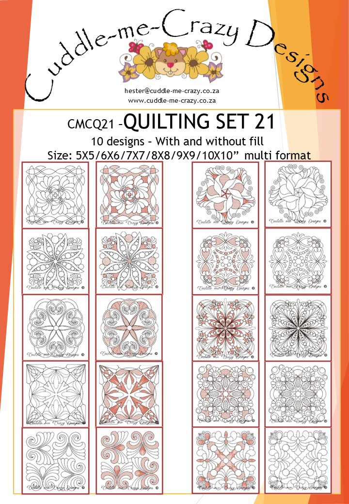 Sale! QUILTING SET 21R500,00 Original price was: R500,00.R125,00Current price is: R125,00. QUILTING DESIGNS, WITHÂ OR WITHOUT A FILL, DIFFERENT HOOP SIZES - QUILTING SET 21 quantity + Add to cart SKU: CMCQ21 Category: FREEMOTION QUILTING DESIGNS Related products QUILTING BORDERS 2 Sale! R500,00 Original price was: R500,00.R125,00Current price is: R125,00. Add to cart QUILTING BORDERS 1 Sale! R500,00 Original price was: R500,00.R125,00Current price is: R125,00. Add to cart QUILTING SET 5 Sale! R400,00 Original price was: R400,00.R100,00Current price is: R100,00. Add to cart QUILTING SET ITH COASTERS 1 Sale! R500,00 Original price was: R500,00.R125,00Current price is: R125,00. Add to cart