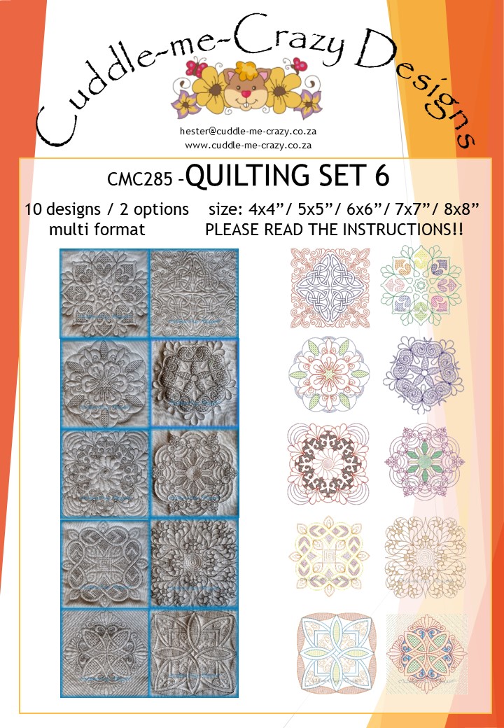 Sale! QUILTING SET 6 with or without backfillR400,00 Original price was: R400,00.R100,00Current price is: R100,00. QUILTING DESIGNS, 5 HOOP SIZES, set with outlines, with or without backfill - QUILTING SET 6 with or without backfill quantity + Add to cart SKU: CMC285 Category: FREEMOTION QUILTING DESIGNS Related products QUILTING SET 3 with/without backfill Sale! R500,00 Original price was: R500,00.R125,00Current price is: R125,00. Add to cart QUILTING SET 20 Sale! R500,00 Original price was: R500,00.R125,00Current price is: R125,00. Add to cart QUILTING SET 9 with or without backfill Sale! R400,00 Original price was: R400,00.R100,00Current price is: R100,00. Add to cart QUILTING SET 5 Sale! R400,00 Original price was: R400,00.R100,00Current price is: R100,00. Add to cart
